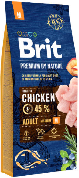 A Brit Premium by Nature Adult Medium egy ínycsiklandó, teljes értékű csirkés száraztáp felnőtt kutyáknak. Kifejezetten közepes testméretű felnőtt kutyáknak kifejlesztett eledel. Kiválóan emészthető válogatott összetevők és prebiotikumok támogatják a kutyák emésztését. A csirkehús jól hasznosuló fehérjékben és aminosavakban dús szárnyashús. Természetes kondro
