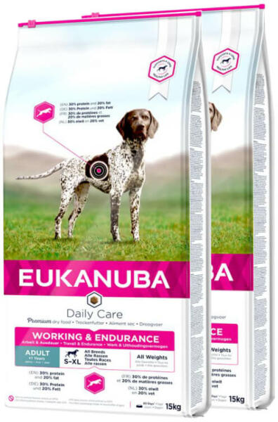 Adult Premium Performance Working & Endurance All Breeds Speciális száraz táp extrém teljesítményorientált munkakutyáknak; megfelelő tápanyagtartalom és különösen magas fehérje-részarány a maximális kitartásért, Omega-3 zsírsavak a szaglóérzék fejlesztésére. Az Eukanuba 10 éves megfigyelései azt mutatják, hogy a kutyák átlagon felüli magas életkort is elérhetn