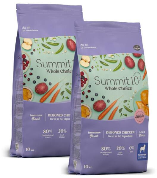 Summit 10 Whole Choice Senior/Light 2x10 kg Teljesértékű, gabonamentes száraz kutyatáp közepes- és nagytestű, 7 évesnél idősebb vagy túlsúlyos felnőtt kutyáknak. A Summit 10 Dog Whole Choice Senior/Light száraztáp tökéletes választás lehet 7 évnél idősebb vagy túlsúlyos, közepes- és nagytestű kutyáknak. A könnyen emészthető, alacsony zsírtartalmú, csirkehúsos re