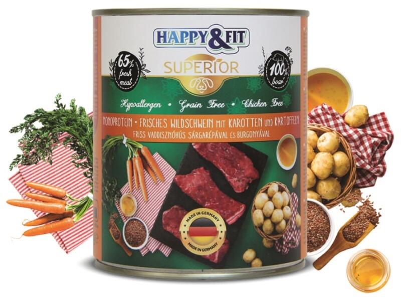 Prémium kutyaeledel friss vaddisznóhússal, sárgarépával és burgonyával, természetes alapanyagokból, mesterséges adalékanyagok nélkül. Tápláló és könnyen emészthető, ideális választás minden korú és méretű kutyának. Segít kutyád egészségének megőrzésében és energikus mindennapjaiban. A Happy&Fit Superior Dog Konzerv Friss Vaddisznóhús Sárgarépával és