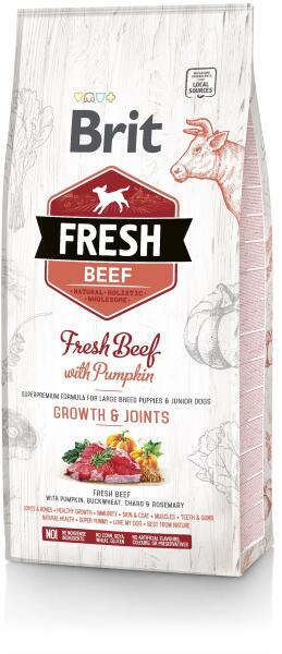 A Brit Fresh Marha és Sütőtök Puppy Large Bones & Joints egy teljes értékű marhahúsos száraztáp nagytestű kölyök kutyák számára. A Brit Fresh termékcsalád egy magas színvonalú, holisztikus állateledel, amely nagy mennyiségű friss húsból és válogatott egyéb összetevőkből készül. Ideális átlagos aktivitású nagytestű kölyök kutyáknak. Ínycsiklandó marhah