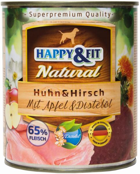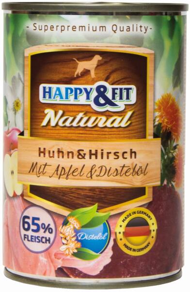 A Happy&Fit Natural Dog Konzerv – Csirke & Szarvas Almával & Sáfrányolajjal egy teljes értékű eledel felnőtt kutyák számára , amely gazdag csirkehúsban és szarvashúsban , valamint tápláló almában és jótékony hatású sáfrányos szekliceolajban . Az eledel nem tartalmaz gabonát , GMO-t , hozzáadott ízfokozókat vagy tartósítószereket , így biztosítva a kut