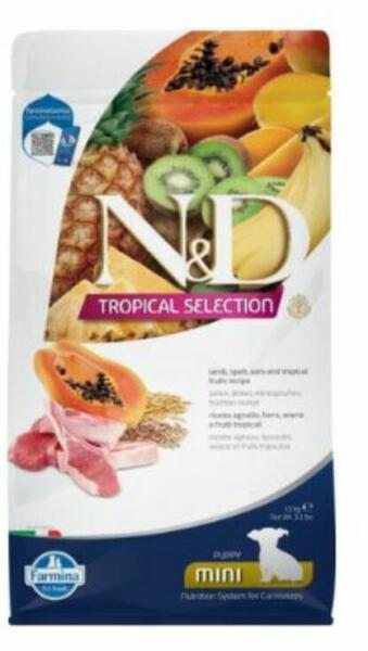 N&D Tropical Selection Dog Lamb Puppy Mini 1,5kg Teljes értékű eledel kistestű kölyök kutyák és vemhes vagy szoptató szuka kutyák részére alacsony glikémiás indexű ősi gabonafélékkel és Trópusi gyümölcsökkel (papaya, a mangó, az ananász, a banán és a kiwi ). A TRÓPUSI GYÜMÖLCSÖKBŐL VITAMINOK SOKASÁGA A KEDVENC ÉTELÉBEN! Az alacsony glikémiás indexű ősi ga
