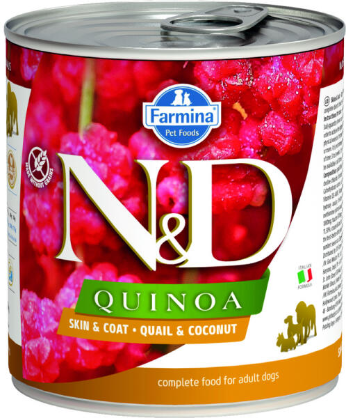 Az N&D dog Quinoa konzerv egy teljes értékű nedveseledel felnőtt kutyáknak, fürjjel és kókusszal. Az eledel kizárólag válogatott összetevőkből áll. segíti a kutyusok anyagcseréjét és emésztését. A kifejezetten sovány, alacsony koleszterinű fürj hús aminosavakban és B vitaminokban gazdag. Könnyen emészthető. A tápban lévő quinoa egy magas fehérje tartalmú magv