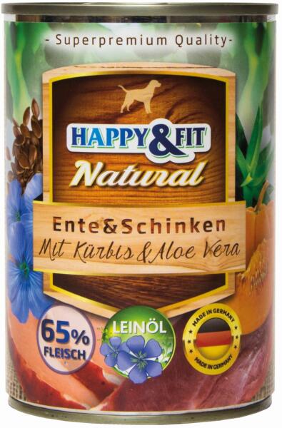 A Happy&Fit Natural Dog Konzerv – Kacsa & Sonka Sütőtökkel & Aloe Verával egy teljes értékű eledel felnőtt kutyák számára, mely gazdag kacsahúsban , sonkában , és a kutyája számára előnyös hatású sütőtökben és aloe verában . Ez az ízletes és tápláló étel nem tartalmaz gabonát , GMO-t , hozzáadott ízfokozókat vagy tartósítószereket , így biztos
