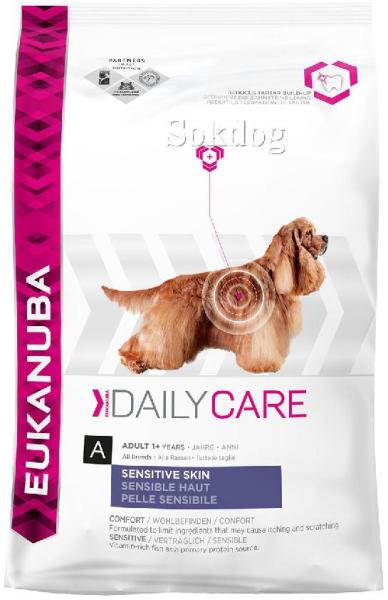 A Eukanuba Daily Care Sensitive Skin teljes értékű, kiegyensúlyozott száraztáp felnőtt (1-7 év) kutyáknak, mely elősegíti az egészséges bőr és a ragyogó szőrzet kialakulását az optimális arányú omega-6 és omega-3 zsírsavak segítségével. A Eukanuba Daily Care Sensitive Skin kizárólag kiváló minőségű, gondosan válogatottalapanyagokat tartalmaz, így biztosítva a 1