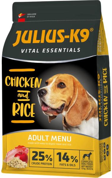 JULIUS K-9 12kg Adult Vital Essentials (szárnyas, rizs) száraztáp - felnőtt kutyák részére (12kg) JULIUS-K9 VITAL ESSENTIALS 12kg ADULT CHICKEN&RICE Teljesérté kű szárazeledel felnőtt kutyák részére. A JULIUS-K9 a magyar tulajdonú világsikerű márka bővítve a márka kínálatát, az állateledel piacon is igyekszik megbízható minőséget biztosítani az Ön Kedvence szám