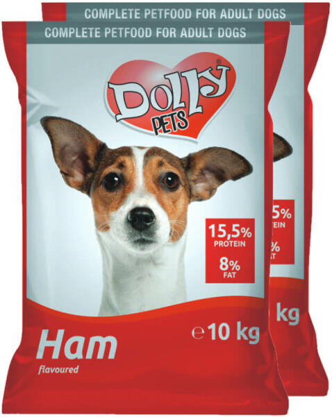Dolly Száraz Kutyaeledel Sonkás Dolli dog kutyatáp normál aktivitású felnőtt kutyák számára sonkás ízesítéssel. 15,5% fehérje és 8% zsírtartalommal. Teljes értékű szárazeledel.