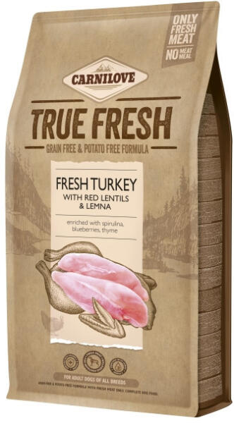 Gabona- és burgonyamentes, kizárólag friss húst tartalmazó recept, bármilyen fajtájú felnőtt kutya számára. Teljes értékű eledel. Összetétel: friss pulyka (60%), borsó, csirkezsír (tokoferolokkal konzervált, 5%), csicseriborsó, szárított alma, vörös lencse, sütőtök, természetes aroma (2%), lazacolaj (2%), sárgarépa (1%), szárított tojáshéj, békalencse fehérje (0