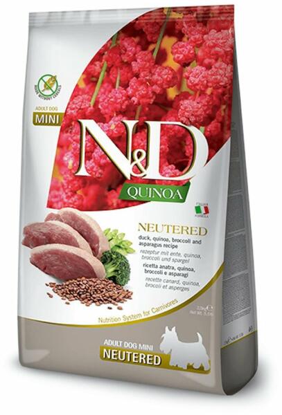 N&D Quinoa Dog Kacsa, brokkoli&spárga neutered adult mini 2,5kg AZ N&D QUINOA EGY FUNKCIONÁLIS TERMÉKCSALÁD GABONAFÉLÉK NÉLKÜL, AMELY TÁMOGATJA KEDVENCE JÓLLÉTÉT Az N&D Quinoa egy innovatív funkcionális eledelcsalád, amely a különleges táplálkozási igényű kutyák és macskák jóllétének támogatása céljából született meg. Minden egyes receptúra gabona