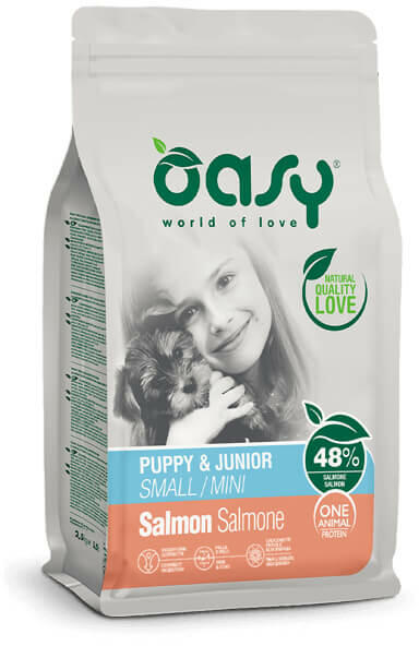 Oasy Dog OAP Puppy Small&Mini Salmon 2,5kg Teljes értékű eledel kistestű kölyökkutyák számára 12 hónapos korig. Egyetlen állati fehérjeforrást tartalmazó szárazeledel, ideális ételintoleranciában, bél- és bőrérzékeny kutyák számára is. Oasy Dog OAP Puppy Small&Mini Salmon 2,5kg Teljes értékű eledel kistestű kölyökkutyák számára 12 hónapos korig. Egyetlen