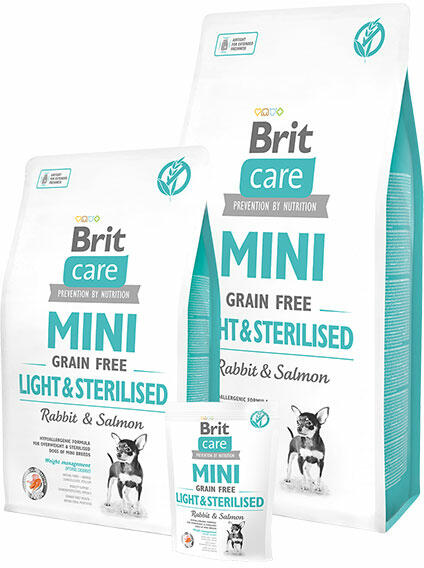 A Brit Care Mini Light and Sterilised egy ízletes, teljes értékű száraztáp kistestű felnőtt kutyusok számára. Kifejezetten túlsúlyos vagy ivartalanított felnőtt kutyák számára. A Brit Care Mini termékcsalád kis testméretű kutyusok igényeihez igazítva lett kifejlesztve. Gabonamentes, hipoallergén recept, így érzékeny gyomrú, vagy ételallergiával küzdő kutyáknak is i