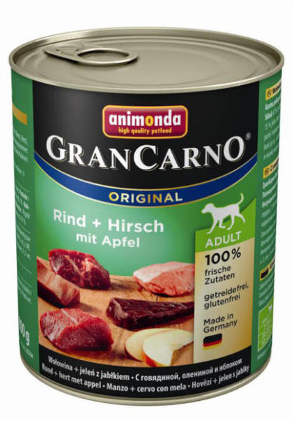 Animonda GranCarno Adult (szarvas + alma) Teljesértékű eledel felnőtt kutyáknak. Kiszerelés: 400 g A kutya köztudottan a farkas leszármazottja. Tizenötezer emberek oldalán töltött év alatt a kutyák jelleme és kinézete rendkívüli változáson ment keresztül. Ezzel ellentétben a táplálkozási szokásaik és igényük a friss állati eredetű nyersanyagokra változatlan maradt.