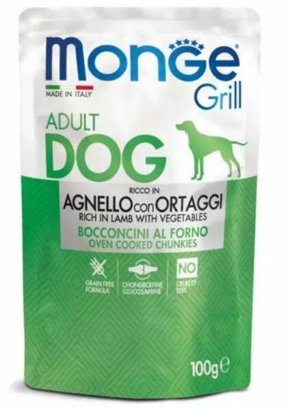 AMonge Grill Adult alutasakos eledel bárány és zöldség prémium minőségű teljes értékű alutasakos eledel felnőtt kutyáknak. Teljes értékű kutyaeledel, melyet kifejezetten a négylábú barátaink ízlése szerint fejlesztettek ki. Sütött bárányhúsból készült recept. Gabonamentesen összeállítva és glükózaminnal és kondroitin-szulfáttal dúsítva ízületi támogatás