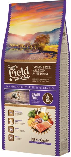 A Sam's Field Adult Grain Free Salmon & Hering egy teljes értékű gabonamentes száraztáp felnőtt kutyák számára lazaccal és heringgel. Minden testméretű kutyának adható az ínycsiklandozó halas eledel. Isteni lazacos-heringes ízvilág. - A lazac jól emészthető fehérjéket tartalmaz. Omega-3 zsírsavakban gazdag (EPA, DHA) melyeknek gyulladáscsökkentő hatásuk van és seg