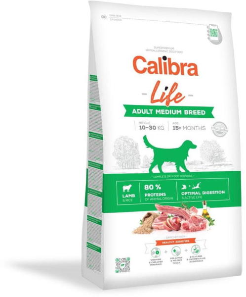 Calibra Dog Life Adult Medium Breed Lamb 12kg Komplett szuperprémium hipoallergén száraz kutyatáp közepes fajtájú felnőtt kutyák számára (10–30 kg). A Calibra Life-t úgy tervezték, hogy táplálja kedvencét egészéletében . A hipoallergén recept kiváló minőségű állati fehérjéken alapul, amelyek a teljes fehérjetartalom 90% -át teszik ki, és alacsony gabonatartalom (cs
