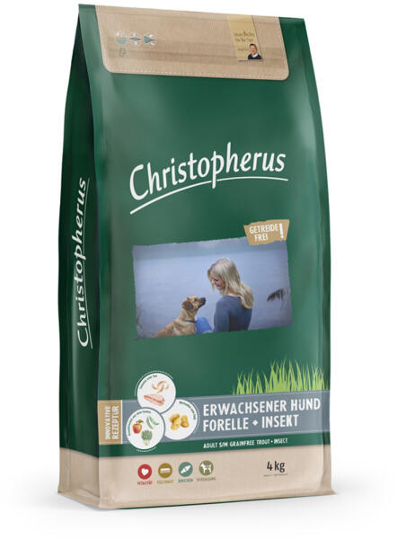 Christopherus Dog Adult Grain Free Pisztráng és Rovar Small & Medium 4kg Teljes értékű, gabonamentes száraztáp kis- és közepes testű felnőtt kutyáknak A Christopherus Dog Adult Grain Free Pisztráng és Rovar kiváló választás érzékeny emésztésű kutyák számára, akiknek a gabonamentes étrend előnyös. A gondosan válogatott összetevők, mint a pisztráng (16%) és a ro