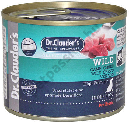 3224220 0 - EAN: 4014355422000 Dr. Clauder's Selected Meat Wild , 200g Teljes értékű eledel gondosan válogatott prémium vadhúsból felnőtt kutyák részére. A Dr. Clauder's "Selected meat" konzerv mesterséges színezékek, hozzáadott szója fehérje vagy húsliszt hozzáadása nélkül készül. Ellenőrzött vitamin és ásványi anyag tartalma biztosítja a lehető legjobb táplálást