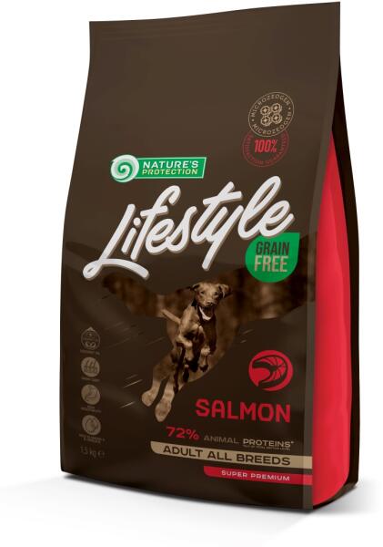 Natures Protection Lifestyle Dog Adult Grain Free Salmon – 1,5kg Gabonamentes lazacos kutyaeledel felnőtteknek – 1,5kg A Natures Protection Lifestyle Dog Adult Grain Free Salmon egy prémium minőségű, gabonamentes kutyaeledel, amely 42%-os lazactartalmával biztosítja kutyája számára a szükséges tápanyagokat. A lazac gazdag Omega-3 zsírsavakban, amelyek támogatják a kutyája egé