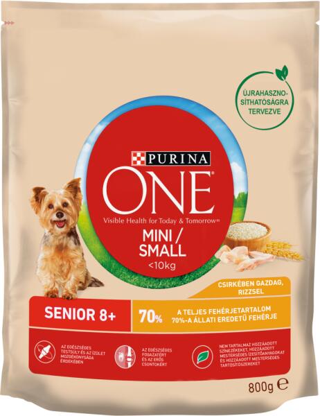 Purina One Mini Senior csirkében gazdag száraz kutyaeledel 800 gSzárított szárnyasfehérje, Búza (20%), Kukorica, Csirke (beleértve: csont, hús, bőr) (14%), Rizs (4%), Szójaliszt, Marhazsír, Hidrolizátum, Glicerin, Kukoricafehérje-liszt, Ásványi anyagok, Szárnyaszsír, HalolajAnalitikai összetevők: Fehérje: 27,0%, Zsírtartalom: 13,0%, Nyershamu: 7,5%, Nyersrost: 1,5%, Omega-3 z