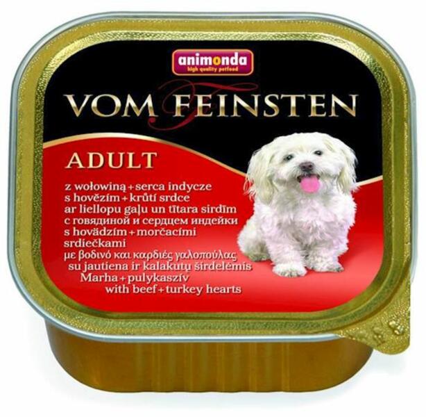 Animonda Vom Feinsten Adult (marha + pulykaszív) Teljesértékű eledel felnőtt kutyáknak. Kiszerelés: 150 g Az animonda Vom Feinsten Adult ellenállhatatlan étkezési élmény, nem csak a különösen válogatós kutyáknak. A Vom Feinsten Adult csúcsminőségű eledel, különösen sok gondosan válogatott húsos alapanyagból, 12 különböző változatban. Összetevők: 63% Hús és hús
