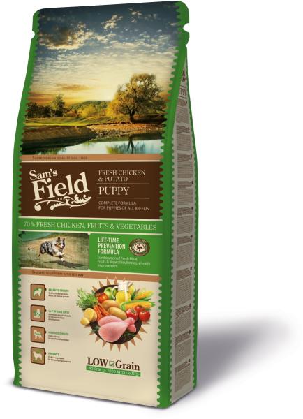 A Sam's Field Fresh Chicken & Potato Puppy egy alacsony gabonatartalmú szárazeledel kölyökkutyák számára. A Sam's Field Fresh Chicken & Potato Puppy egy alacsony gabonatartalmú szárazeledel kölyökkutyák számára. 70% Csirke, gyümölcs és zöldség Teljes értékű receptúra minden test méretű kölyökkutya számára. - Kiegyensúlyozott növekedés: Csirkefehérjében és