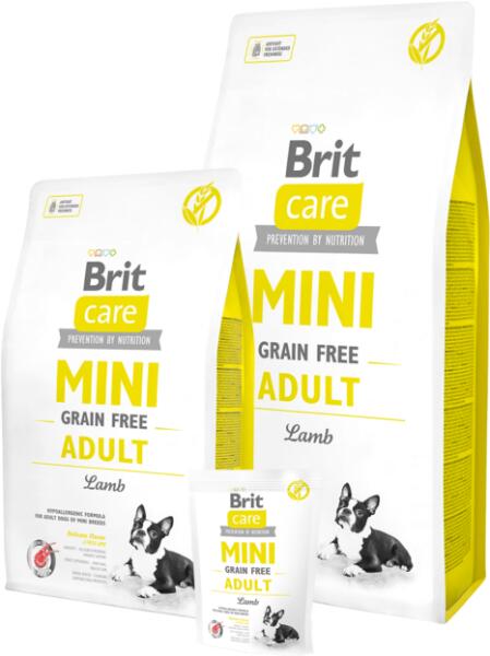Brit Care Mini Grain-Free Adult Lamb 400g - Termékleírás Szárazeledel felnőtt miniatűr fajtájú kutyáknak ( 1-10kg). Hipoallergén, gabonamentes formula bárányhússal. Szuper prémium teljes értékű eledel hipoallergén formulával, amely nem tartalmaz búzát, szóját vagy más genetikailag módosított gabonát. Gluténérzékeny kutyáknak, ételallergiás és érzékeny emésztőr