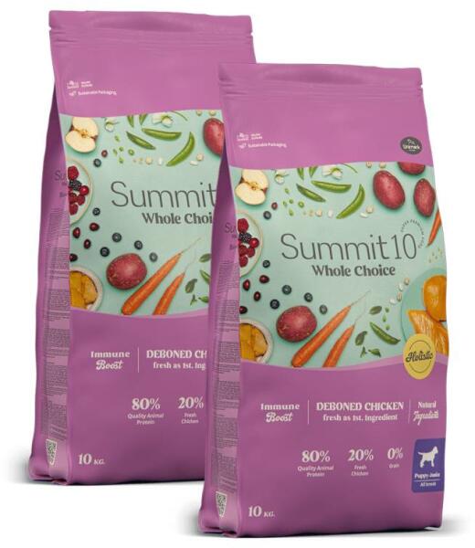 Summit 10 Whole Choice Puppy Teljesértékű, gabonamentes száraz kutyatáp 2-12 hónapos korig, minden fajta és méretű kölyökkutyának Friss csirke biztosítja a megfelelő mennyiségű energiát, vitaminokkal, ásványi anyagokkal és nagy mennyiségű húsfehérjével a kölyök fejlődésének elősegítésére. Főbb jellemzői: Friss hússal Gabonamentes Ideális a növekedéshez Könn