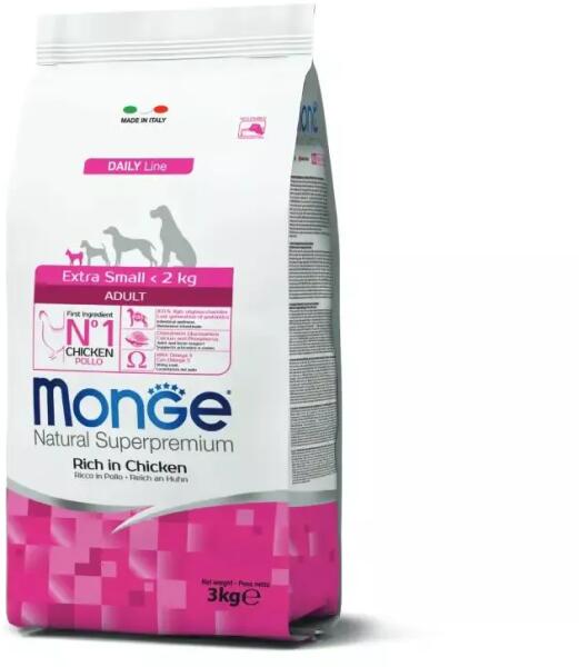 Monge Dog Daily Line Extra Small AdultTeljes értékű szárazeledel 2 kg-nál kisebb, felnőtt kutyák számára csirkével. A kiváló minőségű alapanyagoknak és az olasz kutatómunkának köszönhetően egészséges táplálkozást biztosít kutyájának. A termék fő összetevője a csirke, amely könnyen emészthető és a friss hús hozzáadásának köszönhetően nagyon ízletes. A re