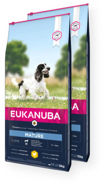 Eukanuba Thriving Mature Medium Vitálanyagokban gazdag száraz táp 7-10 éves, kis- és közepes termetű kutyáknak. Kiegyensúlyozott receptúra friss csirkével, kalciummal és glükozaminnal. Korábban: Mature & Senior Medium Breed. Az Eukanuba 10 éves megfigyelései azt mutatják, hogy a kutyák átlagon felüli magas életkort is elérhetnek: Hűséges társa rászolgál arra, hogy az
