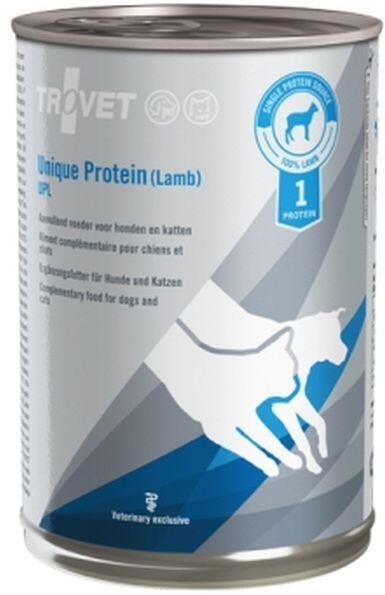 Unique Protein Lamb (UPL) Cat/DogA TROVET UNIQUE PROTEIN konzervek kizárólag egyféle fehérjeforrást tartalmazó hipoallergén diétás tápok, melyek mellé tetszés szerint adható a szénhidrát összetevő. Eliminációs diéta esetén ez főleg főtt burgonya vagy rizs, a tésztafélék gabonatartalmuk miatt erre nem alkalmasak. Nem tartalmaznak semmilyen hozzáadott adalékanyagot, így
