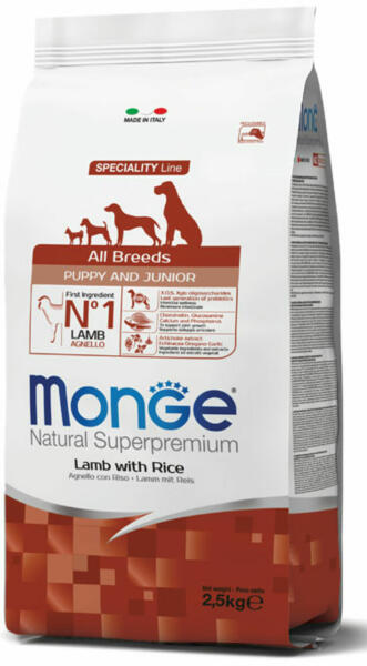 Kiszerelés : 2,5kg Teljes értékű szárazeledel bárányhússal és rizzsel minden fajtájú és testméretű kölyök és junior kutyák számára. Monge Dog Puppy & Junior Bárány-rizs - prebiotikumokkal, vitaminokkal -Hozzáadott mesterséges színezékek és tartósítószerek nélkül -yucca schidigera(pozitv hatással van az emésztésre, és csökkenti a széklet kellemetlen szagát