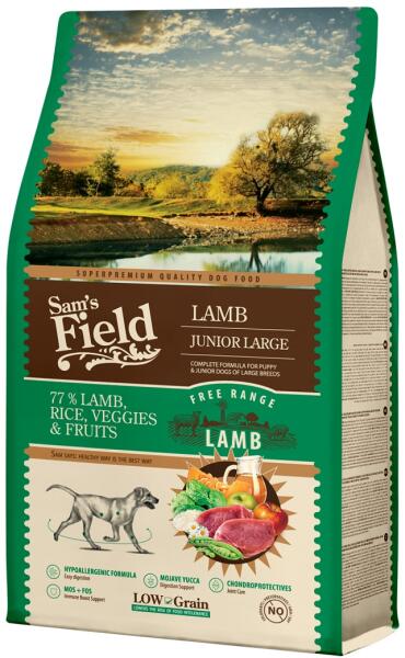 Sam's Field Dog Junior Large LOW GRAIN Lamb 13kg A Sam's Field Junior Low Grain Lamb - Large egy teljes értékű , alacsony gabonatartalmú, hipoallergén száraztáp nagytestű kölyök és fiatal kutyák számára 3 hónapos kortól bárány, rizs, zöldség és gyümölcs felhasználásával. -Hipoallergén -Könnyen emészthető -Csökkentett gabonatartalom -Izületvédő -fehérje 26,0%, nye