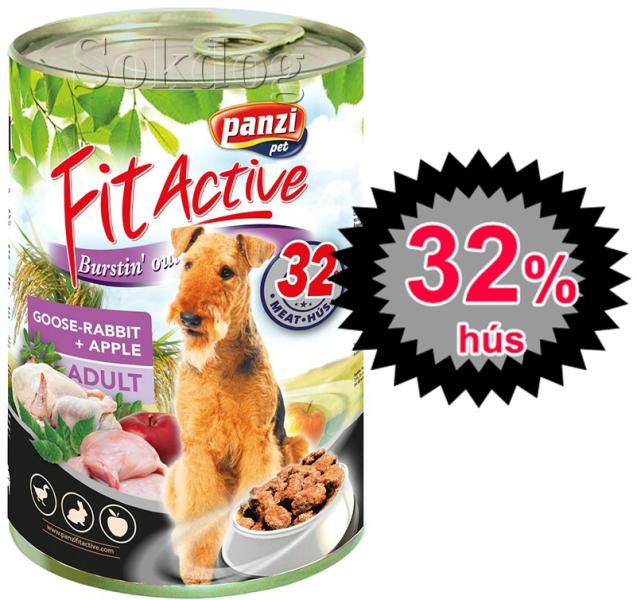 FitActive ADULT DOG Goose&Rabbit 1240g FitActive ADULT DOG (Liba-Nyúl) + alma Az ízek varázsa kedvenceink örömére. A változatos fehérjeforrás minden szempontból fontos és hasznos kutyáink számára. Ezt a FitActive terméket úgy alakítottuk ki, hogy a könnyen emészthető húsok ideális kombinációja ( LIBA, NYÚL ) ideális arányban legyen jelen. A termék minimum 32%-os hú