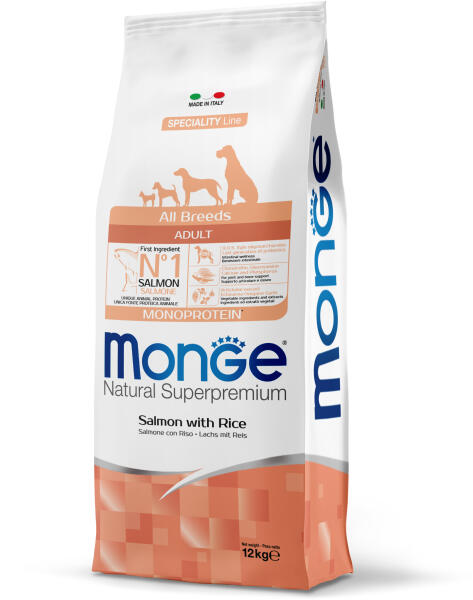 Monge Dog Speciality Line All Breeds Adult Monoprotein Salmon & Rice - lazacból és rizsből készült, teljes értékű eledel felnőtt kutyák számára. A Lazac és a rizs könnyen emészthető fehérjék és szénhidrátok forrásai, így ez tökéletes emésztési problémákkal küzdő kutyák számára. -xylo-oligoszacharidek amik segítenek fenntartani a bél mikroflóra természetes