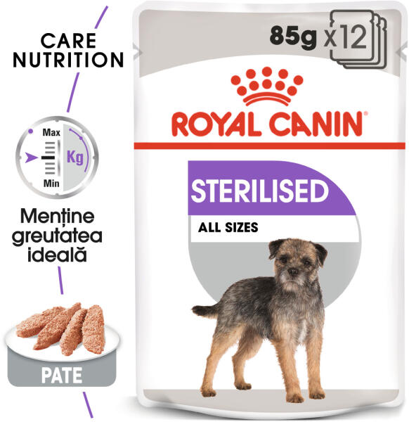 Royal Canin Sterilised Teljes értékű kutyaeledel - Ivartalanított, felnőtt kutyáknak - 10 hónapos kortól - Súlygyarapodásra hajlamos kutyáknak. Fő jellemzők: Segít fenntartani az ideális testsúlyt Canine care nutrition (CCN) program Leírás: Az ivartalanítás után a kutya anyagcseréje lelassul, és noha úgy tűnik, hogy a kutya most már szívesebben pihen a kanapén, mint akt