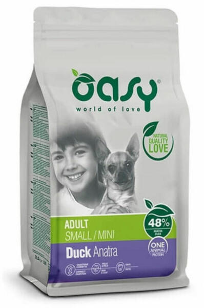 Teljes értékű eledel mini és kistestű felnőtt kutyák számára egy éves kortól Összetétel: friss kacsahús 30%, rizs, dehidratált kacsa fehérje 18%, borsó, állati zsír 7,5%, lenmag 2%, hidrolizált májfehérje 2%, szárított répapép 2%, sörélesztő 2%, ásványi anyagok, dehidratált tengeri alga 0,18%, élesztők (MOS forrás) 0,12%, vadgesztenye kivonat, Mojave yucca 0,02%.