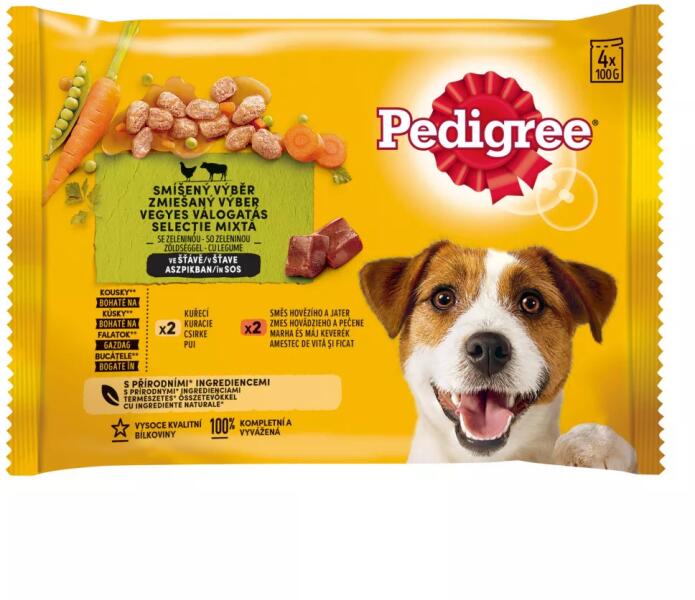 Pedigree pocket Adult csirke+zöldség/marhahús+zöld 2+2x100g, Pedigree Adult zseb "klasszikusaink" zselében kínál választékot. Minden faj esetében különös gondot fordítottunk arra, hogy kutyája minden étkezéskor 100%-ban kiegyensúlyozott étrendet kapjon. A magas állati fehérjetartalom mellett ez az eledel fontos tápanyagokat tartalmaz az egészséges és kiegyensúlyozott étr