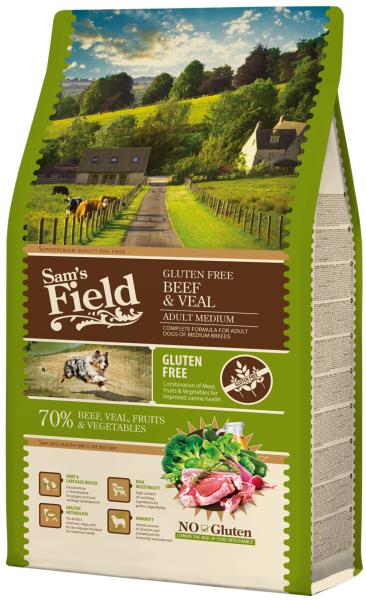 A Sam's Field Adult Gluten Free Beef & Veal - Medium egy teljes értékű csirke és gluténmentes száraztáp közepes testű felnőtt kutyák számára marha- és borjúhússal. Kifejezetten közepes testméretű kutyáknak kifejlesztett száraztáp. Isteni marha-borjú ízkombináció. - A marhahús jól hasznosuló izomhús, esszenciális aminosavakat, B-vitamint, cinket, vasat tartalmaz.