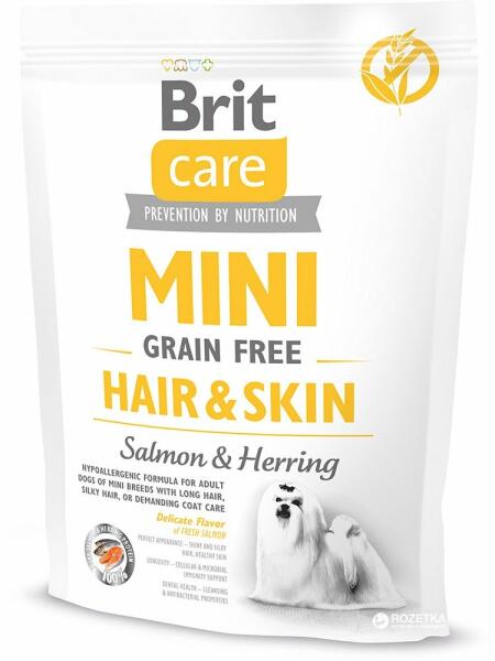 Brit Care Mini Grain-Free Hair & Skin 400g - Termékleírás Szárazeledel felnőtt, miniatűr fajtájú kutyáknak ( 1-10kg között), hosszú, selymes szőrzettel vagy különleges ápolást igénylő szőrzettel. Hipoallergén, gabonamentes formula lazaccal és heringgel kifejezetten az érzékeny bőrű kutyák számára, szőrzetápoló összetevőket is tartalmaz. Szuper prémium teljes