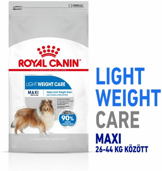 SZÁRAZTÁP Teljes értékű táp felnőtt és idős nagytestű kutyák számára (26-44 kg) 15 hónapos kortól. Hízásra való hajlam esetén. SÚLYKONTROLL A MAXI LIGHT 30%*-kal csökkenti a kutya energiafelvételét, miközben a felvett táplálékmennyiség változatlan marad. A táp elősegíti az ideális testsúly elérését a megemelt fehérjeszint (27%), az alacsony zsírtartalom (11%)