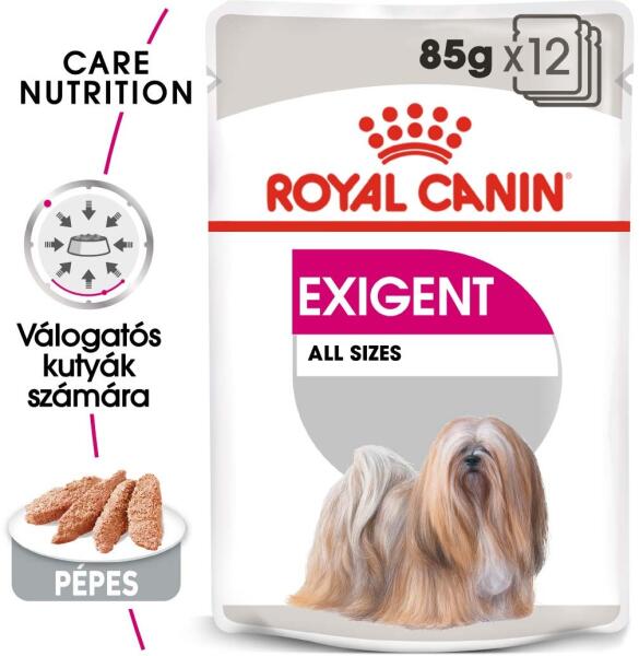 ROYAL CANIN CCN Exigent Pate 12x85g - Termékleírás Minden Royal Canin eledel teljes értékű, ami azt jelenti, hogy 100%-ban tartalmazza a kutya egész életen át tartó jólétéhez szükséges tápanyagokat, kiváló minőségű fehérjéket, zsírokat, rostokat, vitaminokat és ásványi anyagokat. A ROYAL CANIN Exigent Loaf kutyatáp minden méretű kutya számára alkalmas, és minden ol