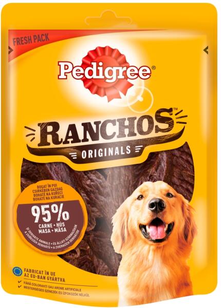 Ranchos ízletes jutalomfalatok csirkeszeletek formájában felnőtt kutyák számára. 95 % állati eredetű fehérjetartalommal és remek aromával a csemegék kisebb darabokra törhetők Összetevők: hús és állati eredetű származékok (95 % összesen, ebből: 26 % csirke), ásványi anyagok, olajok és zsírok Analitikai összetevők: fehérje: 41 %, zsír: 22 %, hamu: 8 %, rostok: 1 %, n