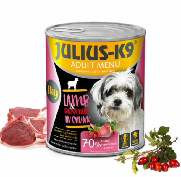 Julius-K 9 Konzerv báránnyal és csipkebogyóval egy felnőtt kutyusoknak készült, teljes értékű nedveseledel. Magas nedvességtartalma hozzájárul a kutyusod napi folyadékbevitelének pótlásához. Hozzáadott csipkebogyó jótékony hatással van az immunrendszer működésére. Összet tel: hús és állati eredetű származékok 40% (melyből bárány 4%), gabonafélék, csipkebogyó