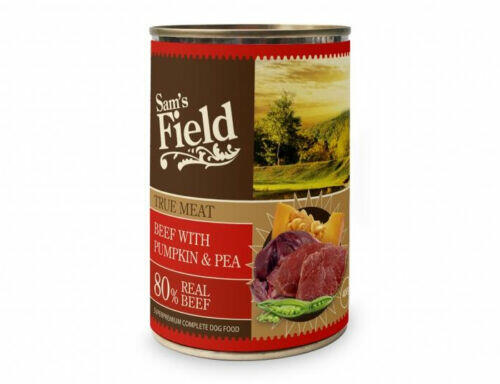 Szuperprémium, teljes értékű kutyaeledel. 60% valódi marhahús. Sam’s Field True Meat Beef with Pumpkin & Pea 60% valódi marhahús Szuperprémium, teljes értékű kutyaeledel. Összetétel: 45% marhahús, 15% marhaszív, 4% sütőtök, 4% borsó, 2% borsóliszt, 1% lignocellulóz, 0,5% lazacolaj Metabolizálható energia: 1,260 kcal/kg Analitikai összetevők: nedvességtartalom 78 %,