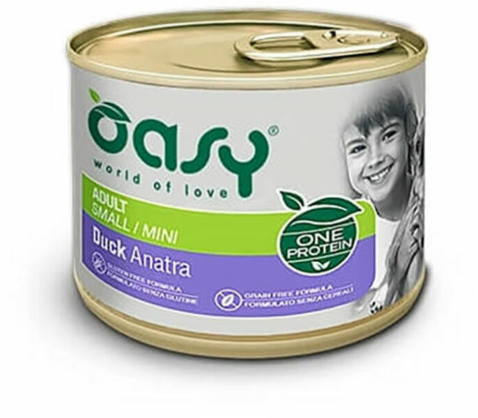 Oasy Dog Konzerv OP Adult Small/Mini Duck 200g Ízletes, egyfehérjéből álló pástétom rengeteg kacsahússal mini és kistestű kutyáknak. Ideális ételintoleranciában, bél- és bőrérzékenységben szenvedő kutyáknak is. Összetétel: kacsa 94%, cukkini 4,1%, növényi olajok és zsírok. Analitikai összetevők: nyersfehérje 8%, nyerszsír 6%, nyershamu 3%, nyersrost 0,5%, nedvessé