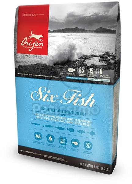 Orijen Six Fish - szárazeledel kutyáknak csendes-óceáni friss szardínia, makréla, tőkehal, lepényhal, sziklahal és sole felhasználásával. Jellemzők :- A 38 %-os tápláló fehérje és a 19 %-os alacsony szénhidrát, az ORIJEN 6 FISH kielégíti a kutya biológiai és evolúciós szükségleteit. - Eltérően más száraztápoktól, az ORIJEN halainak 2/3-a FRISS (hűtve, semmi tart