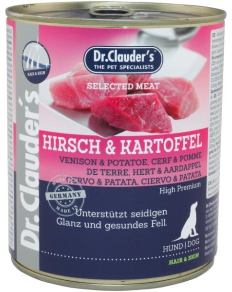 Dr. Clauder's Dog Selected Meat Szarvasos és Burgonyás Konzerv 800g A Dr. Clauder's Dog Selected Meat Szarvasos és Burgonyás Konzerv egy teljes értékű, prémium minőségű eledel felnőtt kutyák számára, amely gondosan válogatott szarvashúsból és burgonyából készül. A termék mesterséges színezékek, hozzáadott szója fehérje vagy húsliszt nélkül készült, így biztosít