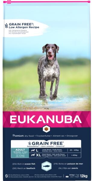 Eukanuba Adult Grain Free Large Ocean Fisch 12kg LEGFONTOSABB ELŐNYÖK A gluténmentes* édesburgonya természetes rost-, vitamin- és antioxidáns-forrás Csirkehú smentes recept Frissen fagyasztott lazaccal Prebiotikus frukto-oligoszacharid és cukorrépapép az egészséges emésztés támogatásáért A borsó és az édesburgonya alternatív szénhidrátforrásként szolgál Természe
