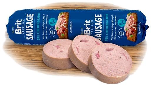 Brit Premium Sausage 95 % Chicken & Lamb Összetétel: 85% csirke (csirkehús, máj, szív, nyak, gyomor), 10% bárány, rizs 3,5%, húslé 1%, kollagén 0,5%. analitikai alkotóelemek: Nedvesség 68,0 %, Nyersfehérje 13,0 %, Zsírtartalom 9,0 %, Nyershamu 6,3 %, Nyersrost 0,5 %. Tápanyag összetétele: D3-vitamin (E671) 250 NE, E-vitamin (3a700) 100 mg, Cink (3b606) 12 mg, Vas (E1) 10 mg, M